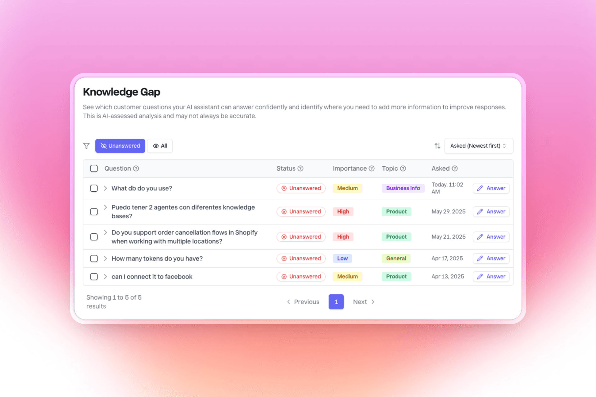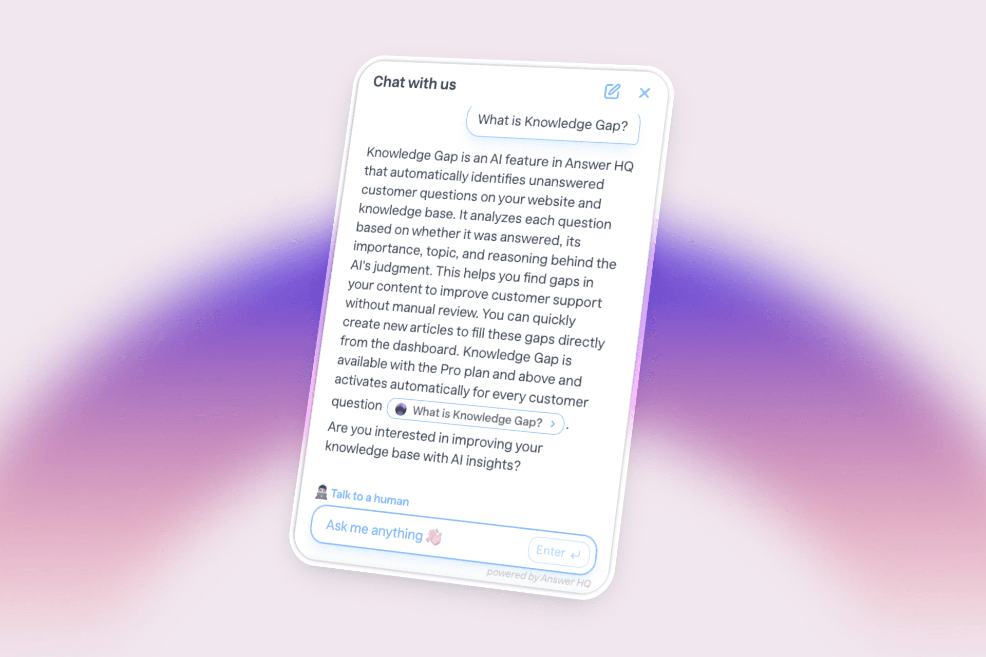 When customers can't find answers, they leave. With Knowledge Gap, Answer HQ uses AI to show you exactly which customer questions are going unanswered, what topics they care about, and precisely what information to add to your Knowledge Vault. Your customers will never hear "I don't know.." ever again.