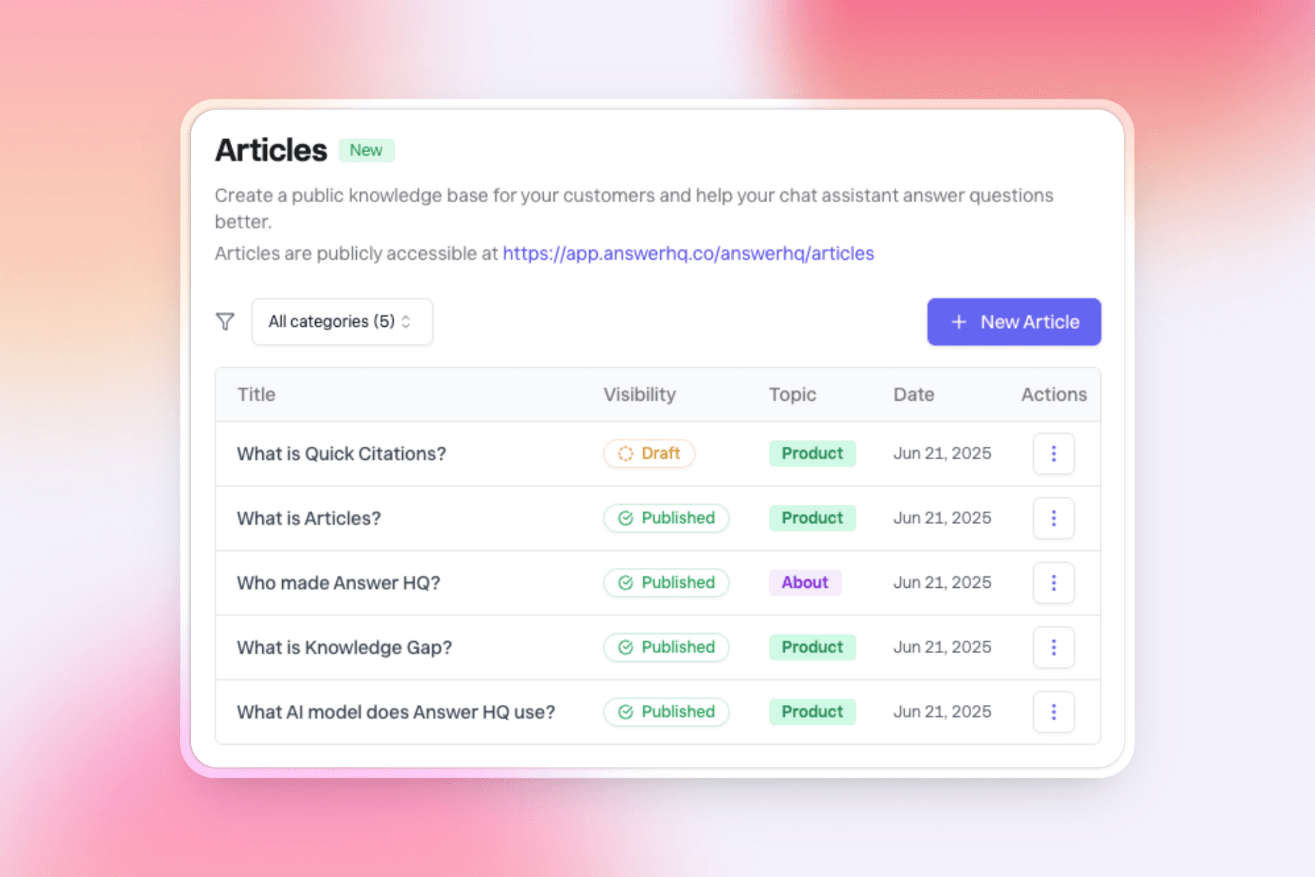 Say goodbye to scattered support pages. With Articles, you can create, host, and manage all your help articles right inside Answer HQ. Create a public help center, share help content easily, and power your assistant with the answers customers need.