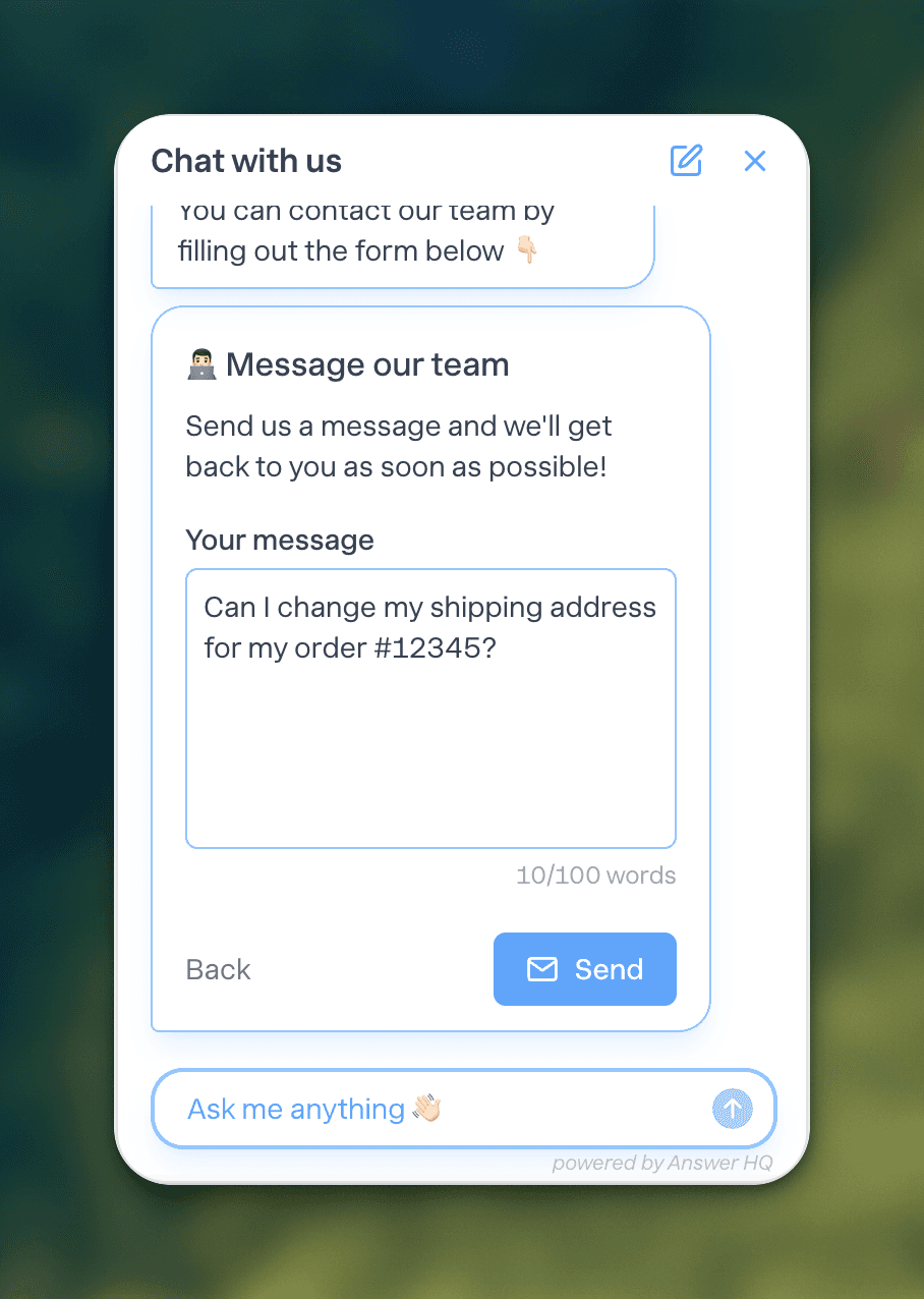 Introducing "Talk to a Human" - our new feature that lets website visitors send messages directly to your team through your AI assistant. It connects customers with your support team when AI can't solve their problem, and takes just 10 seconds to set up.