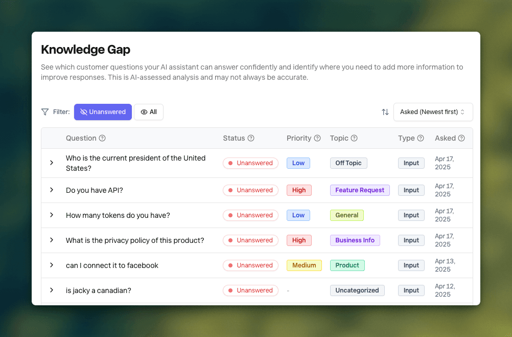 Stop manually reviewing support conversations to figure out what's missing from your knowledge base. Knowledge Gap automatically analyzes every customer interaction to show you which questions need better answers, what topics are most important for your business, and where your AI assistant needs more information. All of this happens automatically in your dashboard - just click "Knowledge Gap" in the sidebar to see exactly what your customers need.