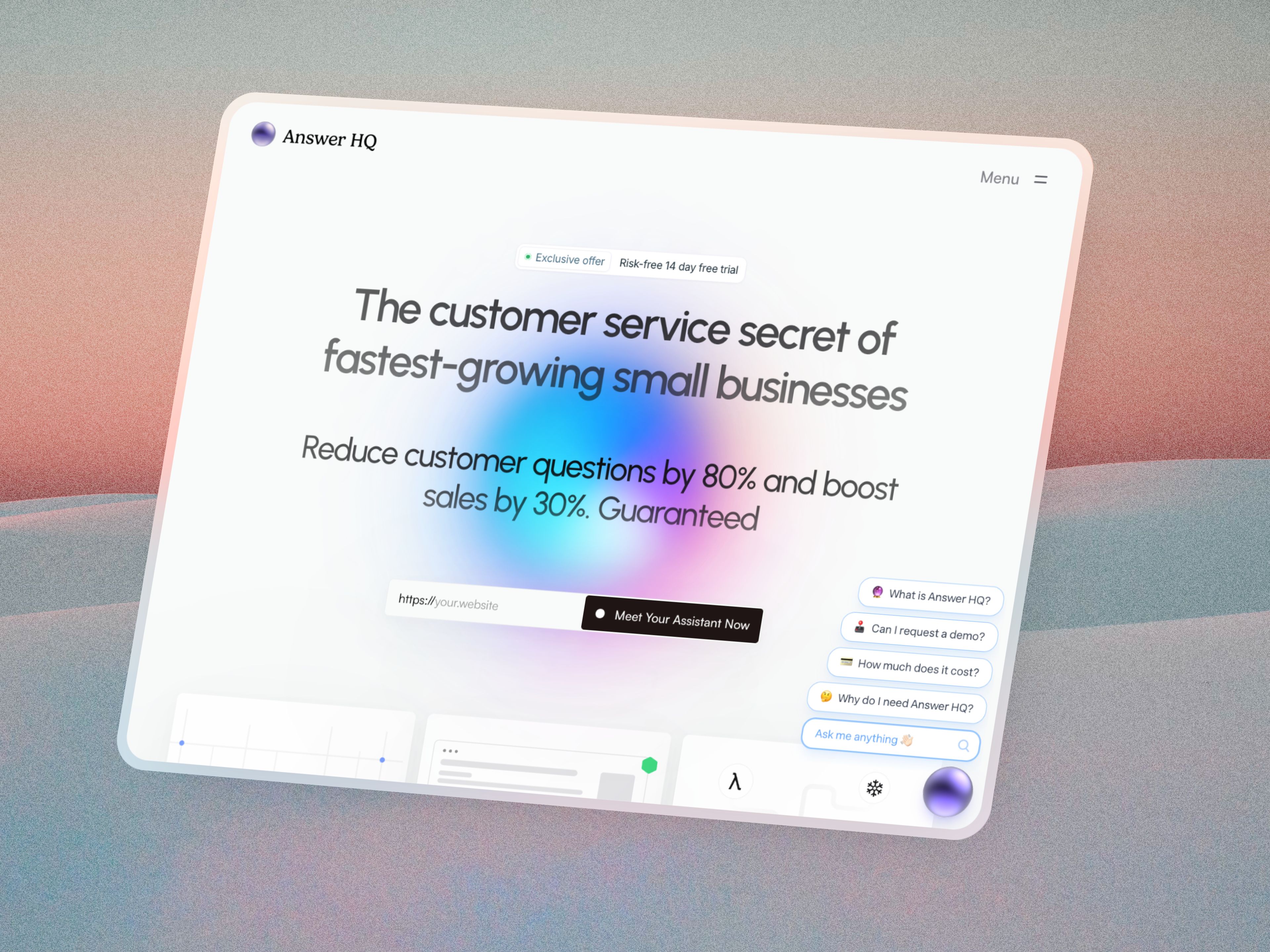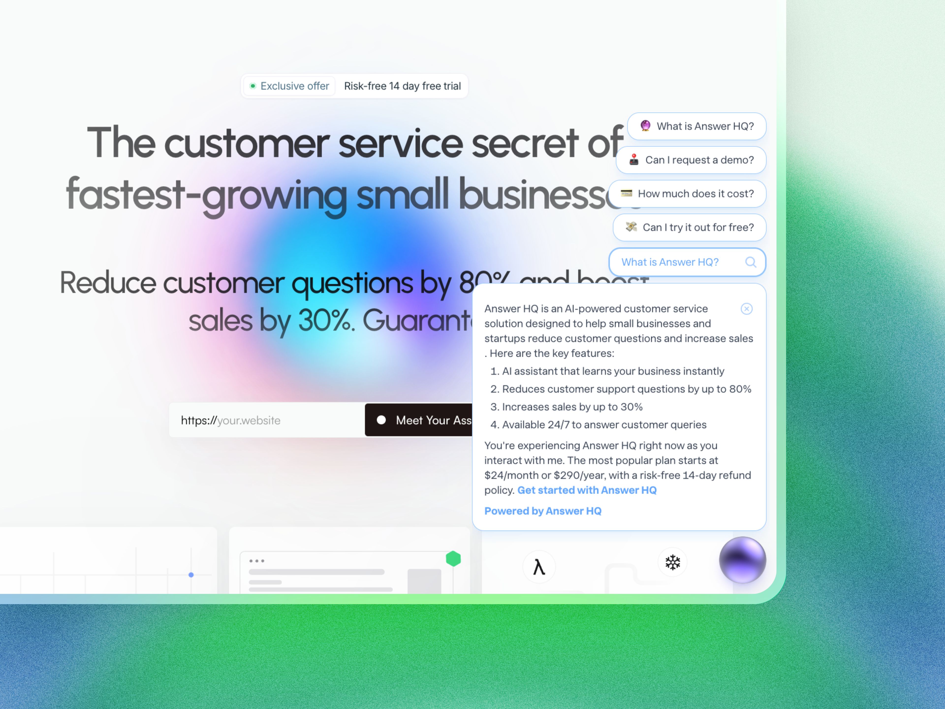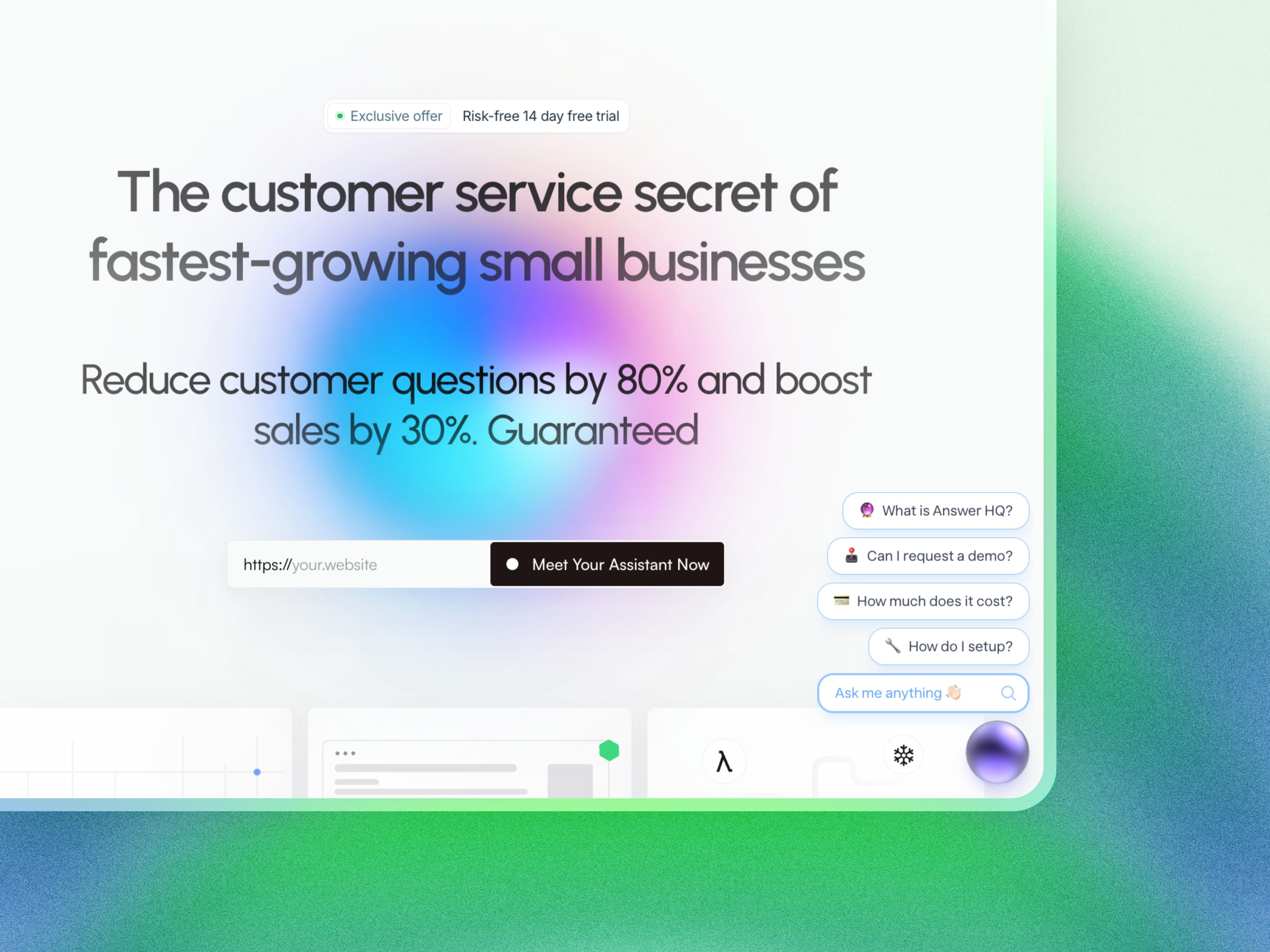 Transform your customer service with Answer HQ's AI assistant. Reduce support questions by 80%, boost sales by 30%, and reclaim your time. Set up in 30 seconds, free 14-day trial.