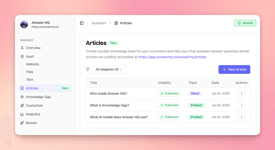 Answer HQ has launched Articles, a new feature that lets you create and manage support documentation directly within your Answer HQ account, eliminating the need for separate platforms like Zendesk. Articles automatically creates a public knowledge base that your AI assistant can reference when answering customer questions, with full rich text editing capabilities and no limits on article count. The feature is available on all plans including Basic, and you can get started by simply navigating to the Articles section and clicking "+ New Article."