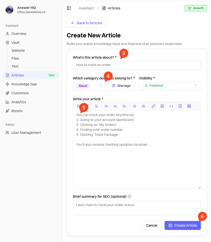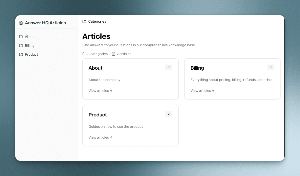 With Articles, you can host and manage support documentation in your Answer HQ account, creating a public knowledge base while also providing content your assistant can use to answer customer questions.