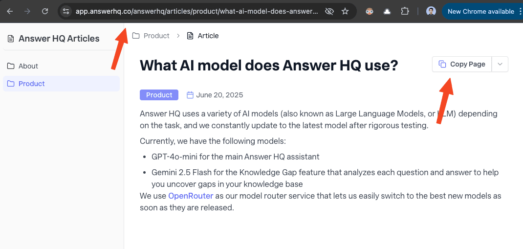 Your articles will automatically appear in your Articles library and will be accessible publicly, so you can easily share links with customers. Even better, your Answer HQ assistant will instantly start using the content to answer related questions, surfacing Quick Citations to the full documentation when they’re most relevant.