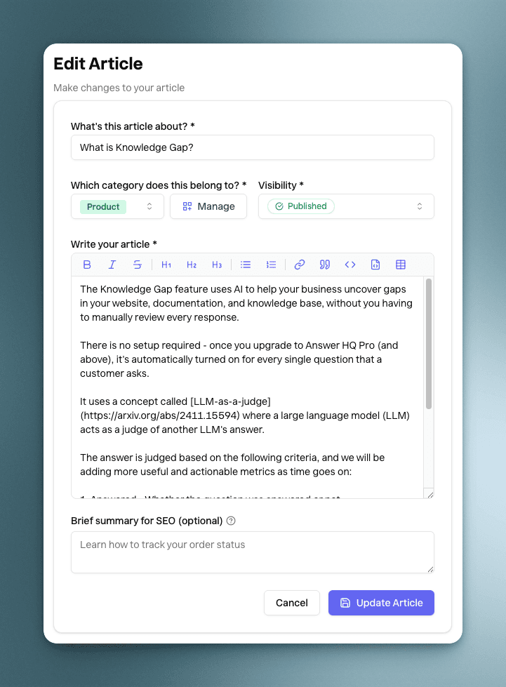 Content created in Articles is fully customizable with a rich text editor – add formatting, tables, links, and more. Plus, there’s no limit to how many articles you can add. Articles is available to all plans, Answer HQ Basic included!