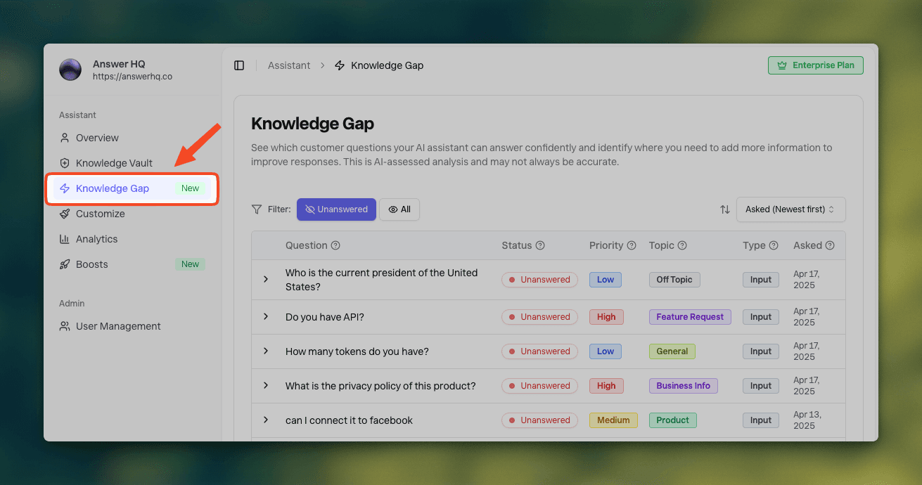 Knowledge Gap Analysis is available now for all Pro and Growth plan customers. If you're on our Basic tier, upgrade to Pro to start identifying opportunities to improve your customer experience.