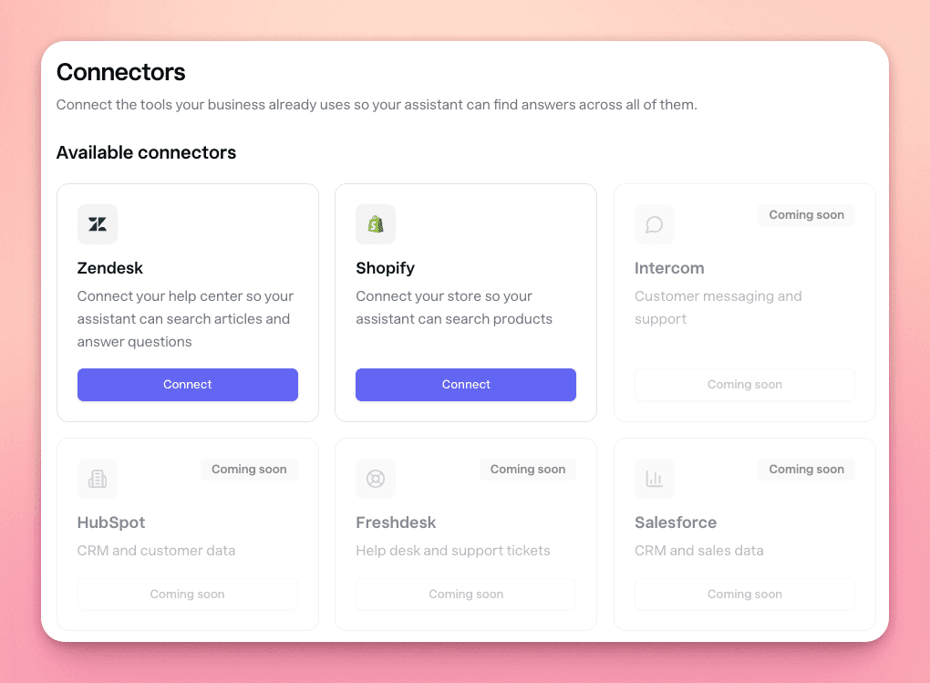 Your assistant can now search your connected services in real time. When a customer asks a question and your assistant doesn't have the answer in its own knowledge base, it automatically searches your Zendesk help center, Shopify store, and more - live, right in the conversation.